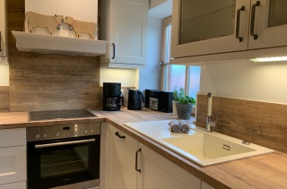 • Komplett ausgestattete Wohnküche mit E-Herd, Geschirrspüler, Kühlschrank, Eierkocher, Wasserkocher, Toaster, Kaffeemaschine